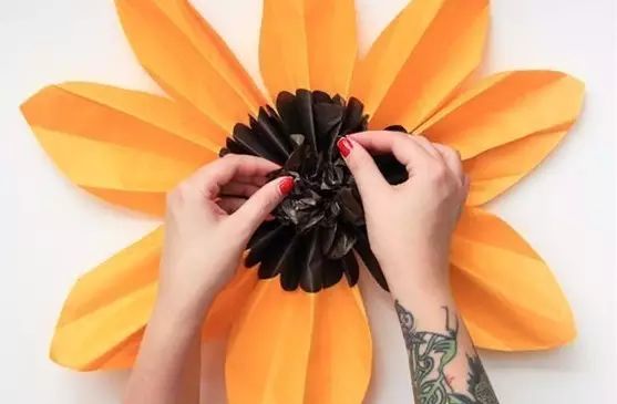 3.将折纸花的花瓣依次展开展开,将褐色花心拎起,弄成不规则状。