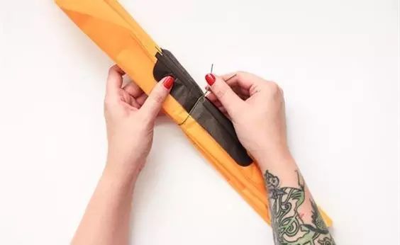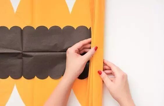 1.将剪好带有花边的褐色或黑色纸张放在展开的黄色带有山包状纸张之上,按照折扇子的方法折叠。