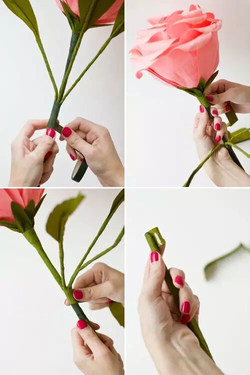 6.可以在花茎上添加几片绿叶做装饰,最后将花茎底部用胶带粘好。