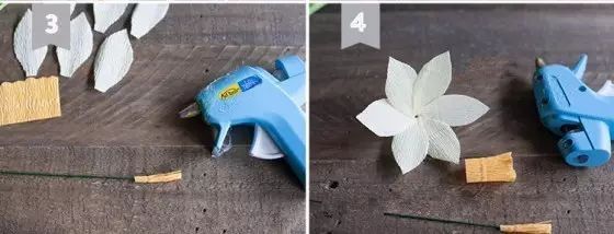 3.在准备好的铁丝上粘上绿色纸胶带或者皱纹纸,然后将5个小花瓣一层层粘在绿色花茎上。