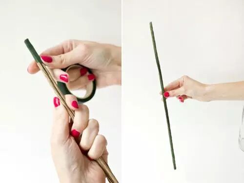 2.将卷好的面条圈按反方向倾斜卷在花茎上,然后将剪好的在“山“字形状的绿叶黏在花茎上。