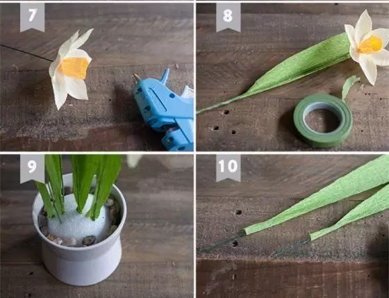 4.将水仙的叶子粘在铁丝上,将制作好的几枝花,插在泡沫垫上。