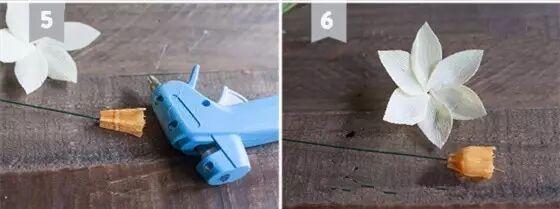 3.将黄色花芯粘在花蕊上,固定后捏成图6形状。