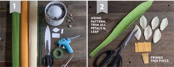 1.将准备好的皱纹纸,剪出图2中的叶子、花瓣、花蕊备用。