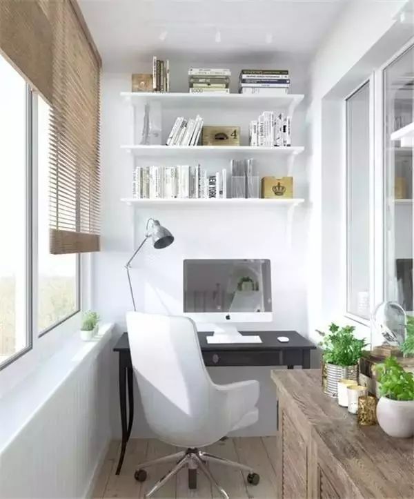 家里面积小,难以单独设有书房或工作间,而如果把阳台与居室打通,阳台就可以成为崭新的书房加以利用了。在靠墙的位置装上层层固定式书架,再放上一张小巧的书桌,用材质多用的窗帘阻隔室外的喧嚣;入夜,还可以伴着柔和的台灯和窗外的月色,读一本心爱的书籍。