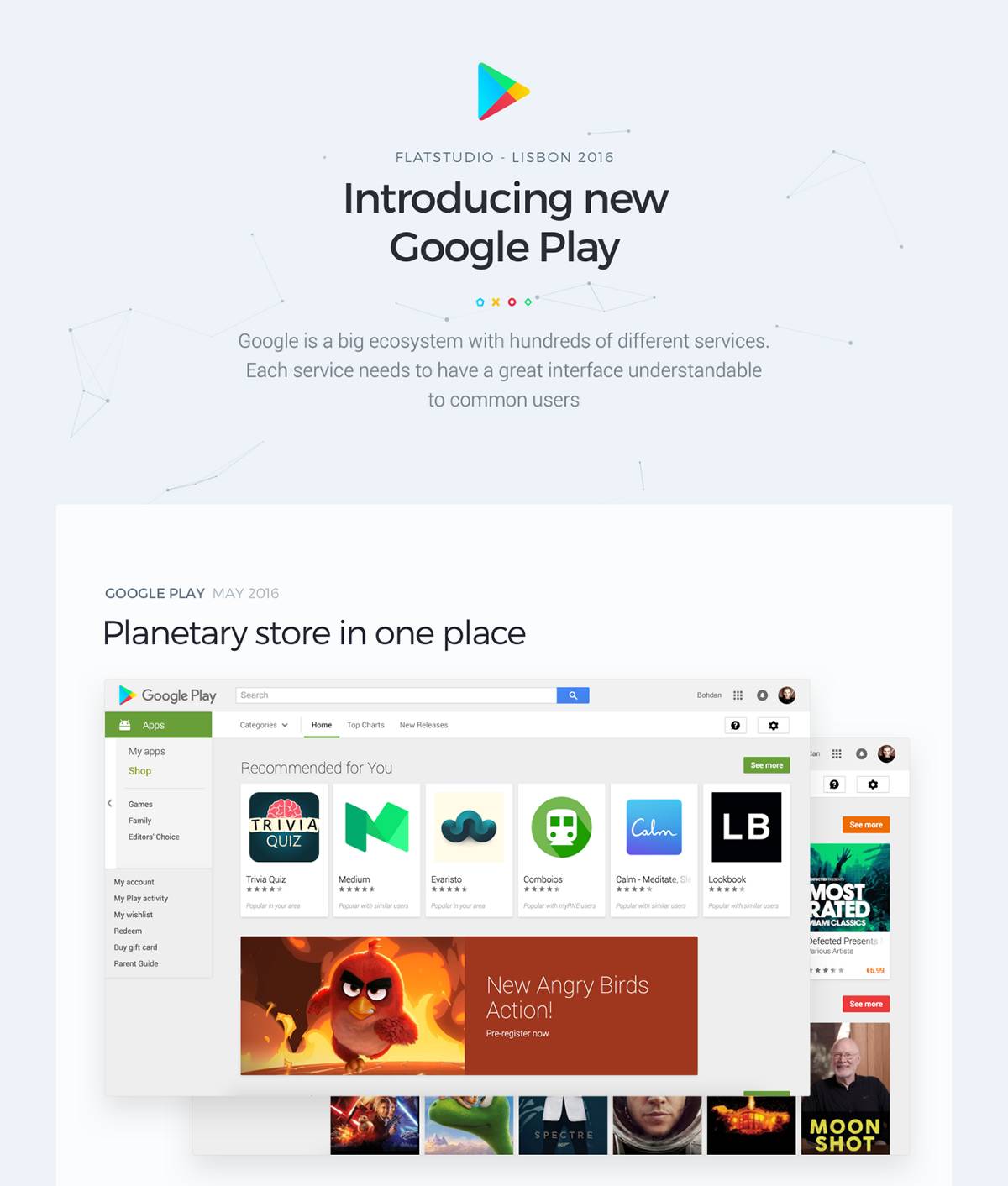 这确实就是Flat工作室把他们对Google Play改版的设计放在UpLabs上出现的情景。我们被他们发布的每个界面所吸引。这真的是一个不可思议的作品,当然,他们也做了一个很令人震撼的展示,这里是预览: