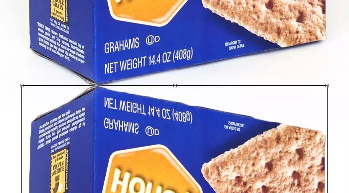 4、创建一个新图层组并命名为“倒影”。把上述3个单独的智能对象的图层移动到这个图层组。选中图层组,然后按CTRL+ T进入自由变换模式。右键单击画布并选择垂直翻转。显示原始图层,拖动图层组至盒子的下角与原始图层盒子的下角重合,然后按下Enter。如图。