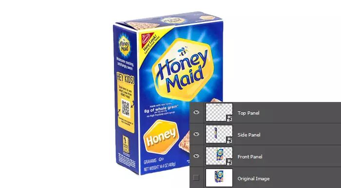将盒子的正面选中,按CTRL + X剪切,CTRL + SHIFT + V粘贴,这时盒子的正面还在原来的位置,只不过是在一个新的图层。右键单击图层面板上的该图层,将其转换为智能对象,然后把它隐藏起来。重复这个过程,将侧面和上方的面剪切到新图层,要确保将它们转换为智能对象。