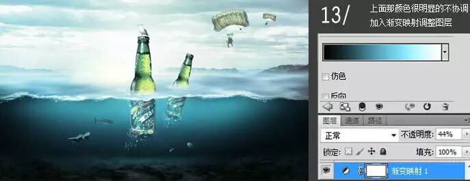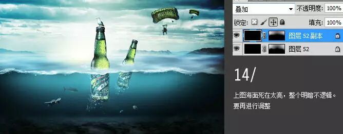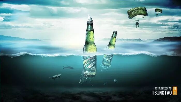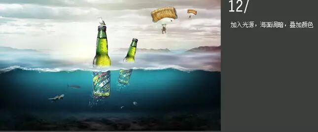 10、加入素材:海龟、金枪鱼、鱼、海鸥、空降人物,和产品。啤酒复制一层,一个啤酒图层下半截用蒙版擦掉,另一个啤酒图层上半截用蒙版擦掉并降低透明度。考验大家的抠图了!推荐阅读:新手教程!PS抠图小技巧