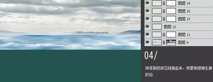 4、用笔刷把浪花链接起来,用蒙版擦掉生硬的边。(画笔不会的 推荐阅读:PS基础 | 画笔入门)