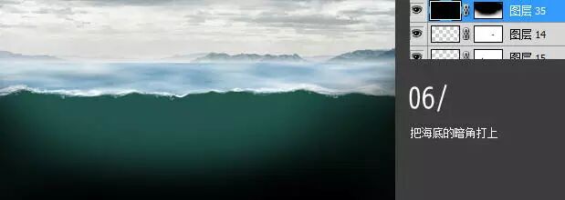 6、把海底的暗角打上。(黑色或者暗的颜色,画笔直接绘制,图层模式选择柔光)