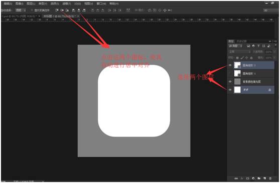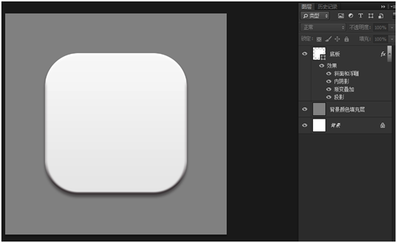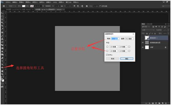 第二步,我们要进行时钟UI的设计,首先,我们做最外层,由外到内的渐进过程。找到ps中的“圆角矩形工具”,设置参数为:512px X 512px 圆角为120 ,颜色填充白色。并且在图层中修改图层名为为底层