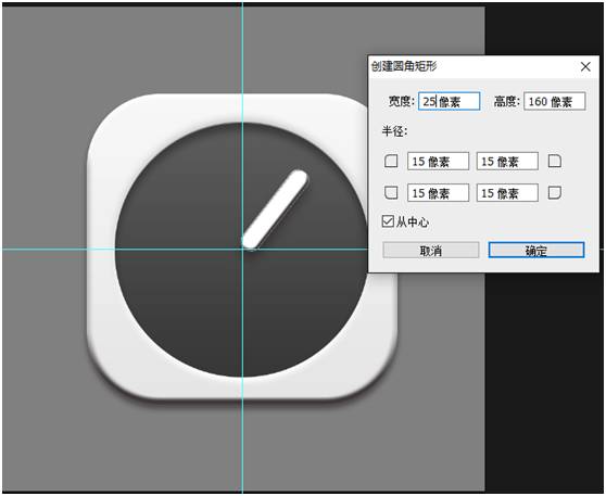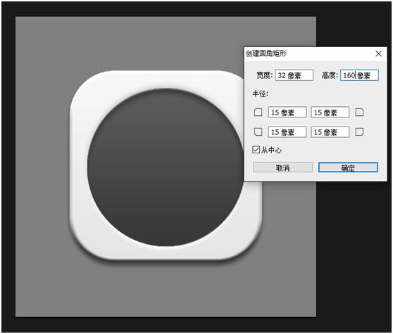 第四步,做完以上之后,我们做指针,用圆角矩形工具绘制一个160px X 32px的圆角矩形,圆角设置成15px ,颜色为白色。命名为指针1