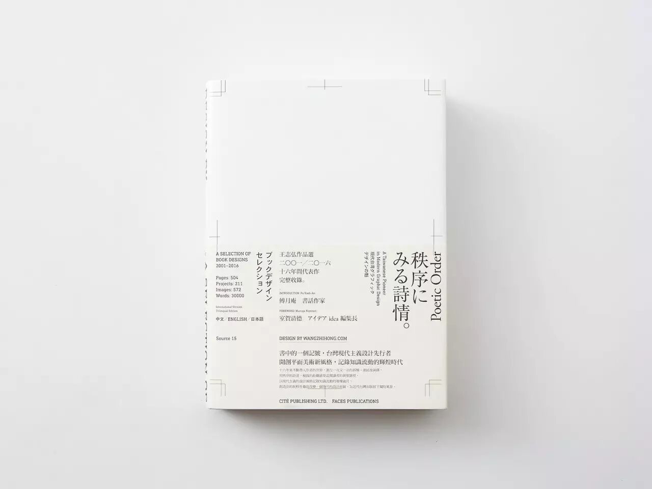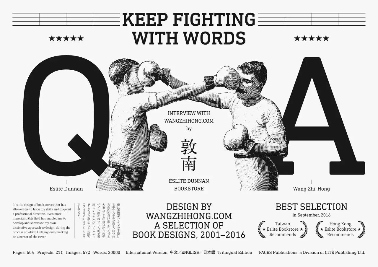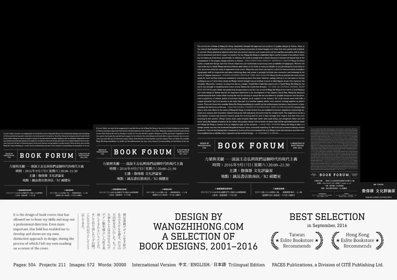 就在去年,王志弘出版了他人生中第一本作品集,《Design by wangzhihong.com》,搜录200本书、542个图像、32000字,是台湾最具分量的平面设计师作品选,探见一个现代主义平设计师风格的诞生与成长轨迹。此书未上市时就在设计in台湾的线上商店被预购100多本,可见影响力。此书又分别收获了2017 台北国际书展大奖非小说类入围、2017 东京 TDC 赏入选、2016 诚品书店阅读职人大赏、2016 博客来 Okapi 年度书籍好设计奖,2016 SDA Award 年度最佳设计等。