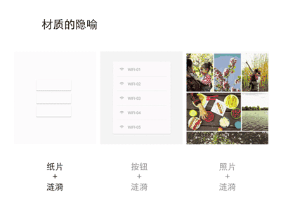 Android的品牌特性表现在其最新的设计语言Material design中。其核心观点Material is the metaphor(材料的隐喻)所讲的就是将不同的物品属性按照不同的场景赋予到界面元素中,让用户有亲切的感受。Andriod挖掘品牌特质的场景,恰恰是通过动效来表现的元素质地。