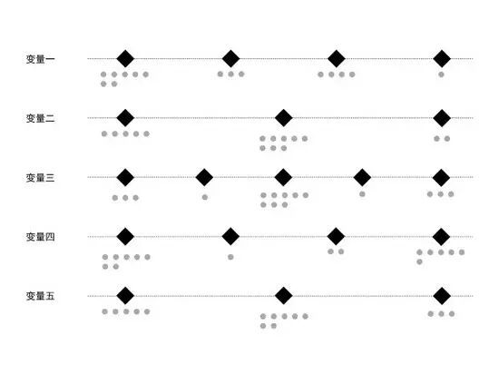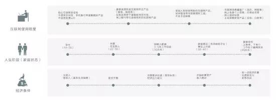 确定关键变量后,我们将每个变量作为一个核心维度去分析收集到的用户数据,将用户相关的行为数据化作一些“信息值”分布在这个维度上。例如,若“互联网使用程度”、“人生阶段”及“经济条件”是用户对某项产品或服务的需求及态度产生差异的关键变量,我们可以将收集到的用户信息在这三个维度上做均匀排布(如下图所示),选取一些典型的用户特征作为这个维度上的“信息值”。