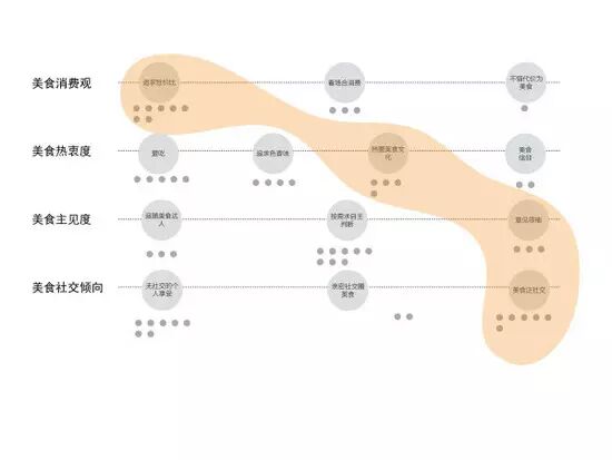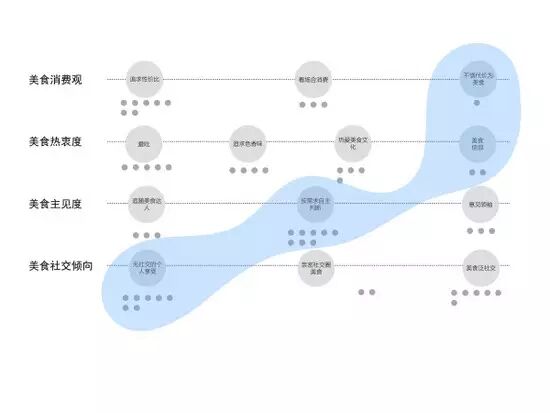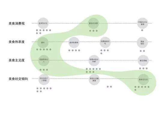 通过一系列的调研,我们收集到了丰富的吃货行为特征。通过分析,我们选取了“美食消费观”、“美食热衷度”、“美食主见度”及“美食社交倾向”作为影响用户美食消费行为的关键变量,并将关键信息值及用户行为特征数量分布进行了一一标注。