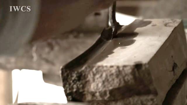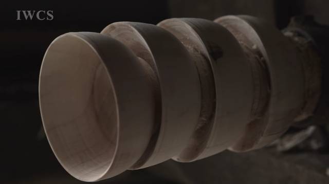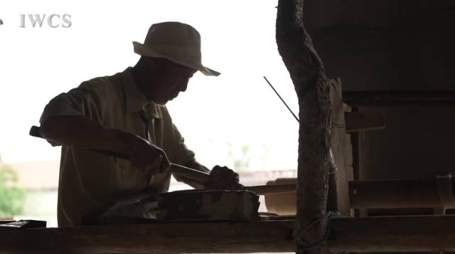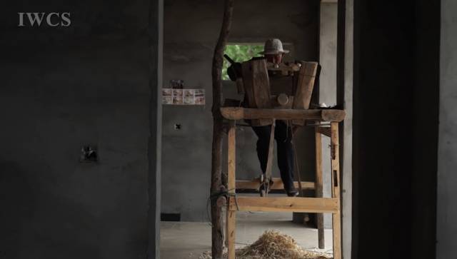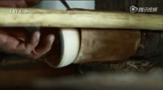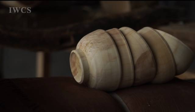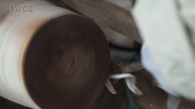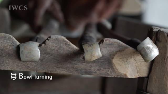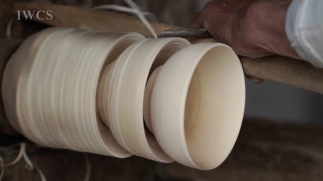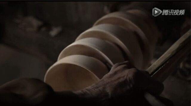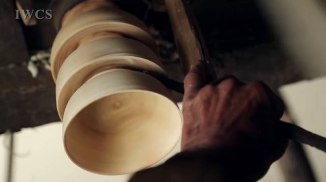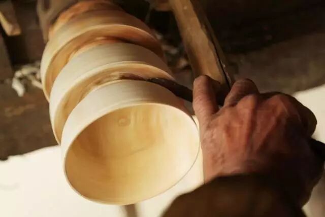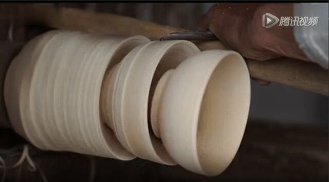 右手负责进刀,四肢一起合作完成木碗的制作。