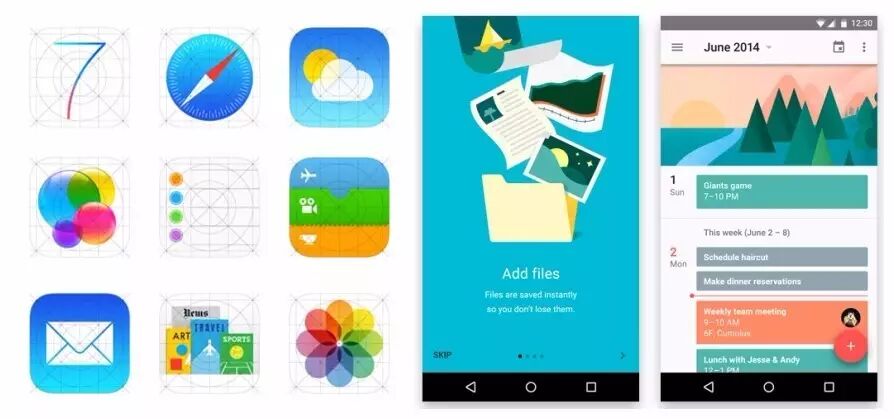 这种设计其实源于80年代,在2010年之后才开始彻底流行起来。微软于当年推出的Windows Phone 7就采取了该种风格,之后Apple和Google也在其产品中使用。