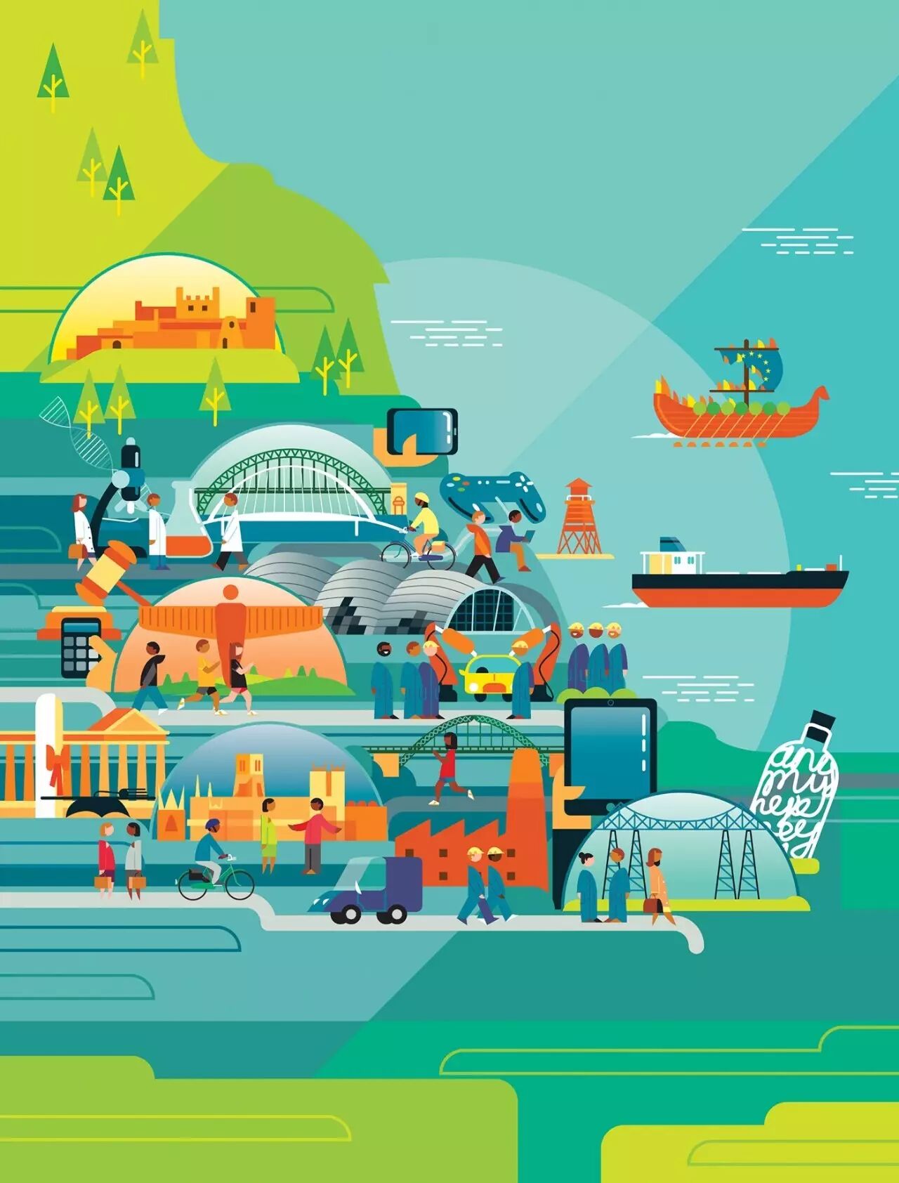 简洁是扁平风格的核心。扁平矢量风格是一种二维的视觉表达,只通过基本轮廓来表达事物,省去很多细枝末节,有一种浓浓的科技感,因此多被运用于表现城市、科技、艺术等主题的插画。