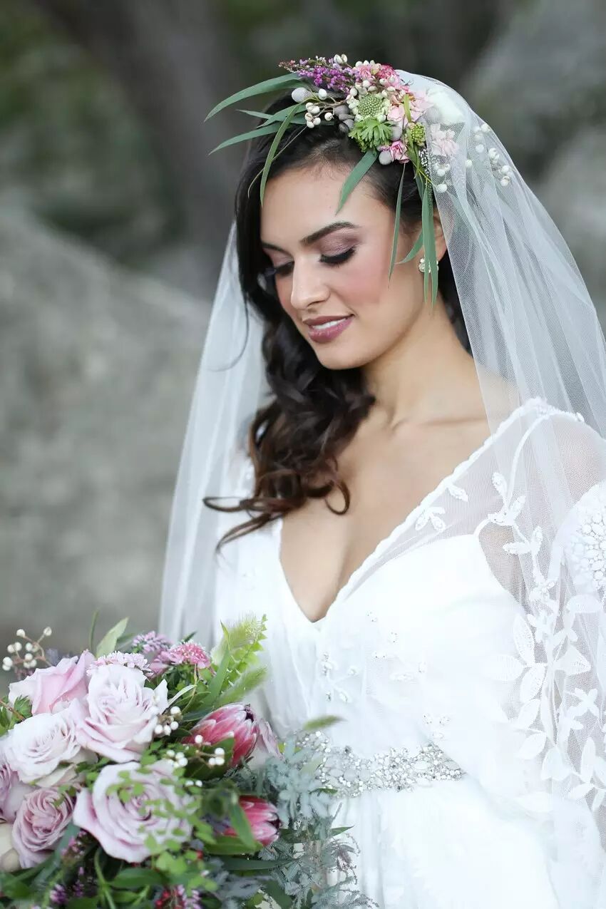 波西米亚风的新娘和伴娘造型可以选用紫色系新鲜花朵制成的花冠来搭配服饰。