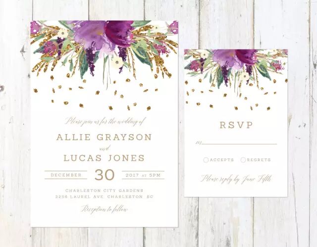 邀请函能让你所有宾客能大致知道婚礼日期,而充满活力的紫色花束水彩画可以使你的邀请函更加完美。