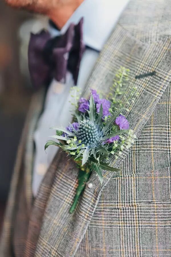 新郎可以尝试一些别致的如胸花或领结这样的紫色系配饰,在展示自己独特品味的同时,为整体造型增加一些值得玩味的小心机。