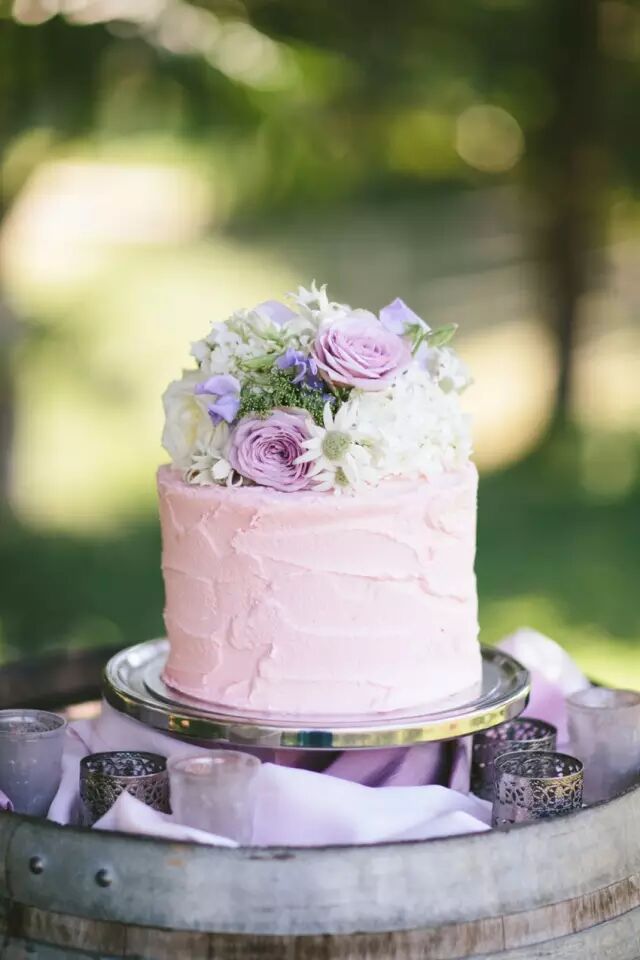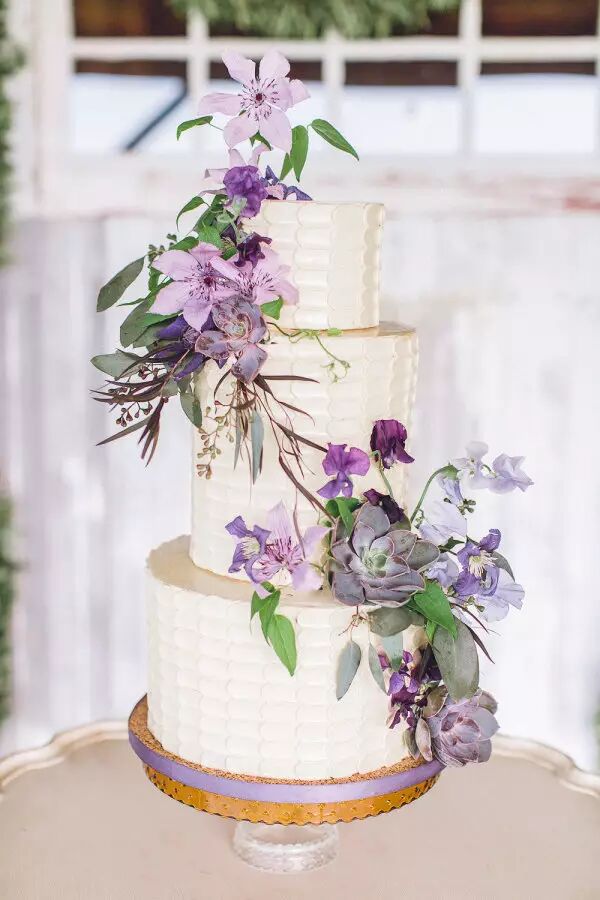 也可以增加一个用紫色丝带缠绕的层次分明的装饰蛋糕,或是用新鲜花朵缠绕的简约白色婚礼蛋糕。
