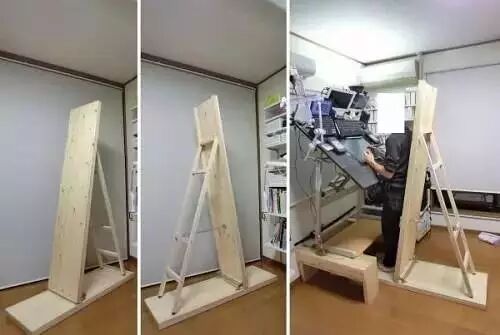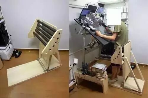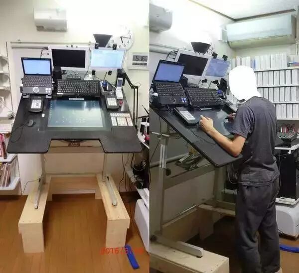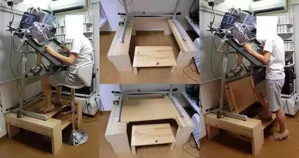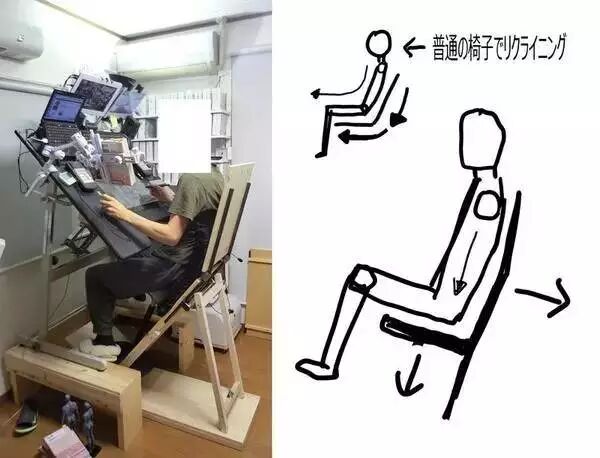 要知道长时间坐着对腰椎和颈椎都不好,但漫画家为了保证思路的完整很少可以离开座位。所以,浜田义一也就自己加工了这款工作台。