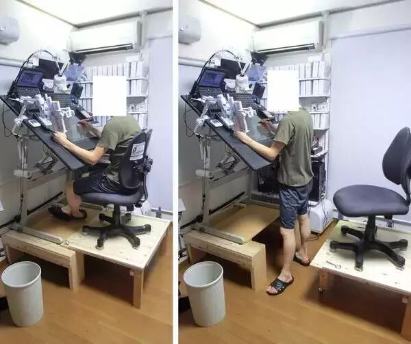 颈椎得到保护了,但是腰椎问题还是没有解决。所以,浜田义一决定要自己动手,首先,他决定从底座入手,原本都是坐着工作,为了腰椎他决定要站着画,所以他在工作台下方加了一个木制底座。这样搭配椅子既能坐着画也能站着画,两全其美呀。