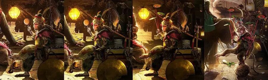 这张稿子我算了一下,来来回回我大改了三次, 小改了四次 。大改意思就是 除了背景没怎么动以外, 基本算是重做 ,话说星爷确实跟电影里面太像了 ,太无厘头了 一开始都是坐着的 、趴着的。 一句话我很喜欢这个画面 ,但是我想让这三个家伙跳舞 ,大腿硬不过胳膊吧 。改呗 ,设计师可以理解我的心情吧 。拿菜刀去吧 角色动作就换了三个 第一次始 让猪站起来 结果站起来了 第二次想让唐僧站起来 也站起来了 。