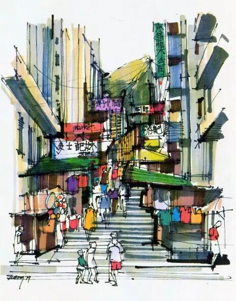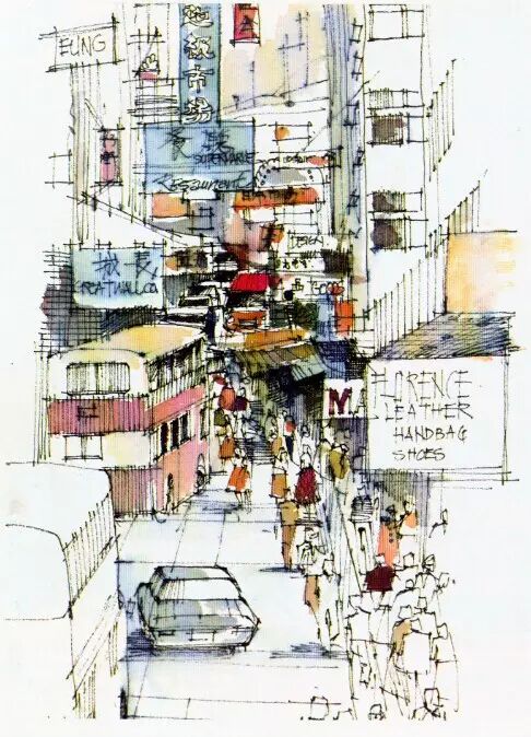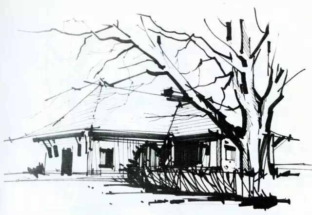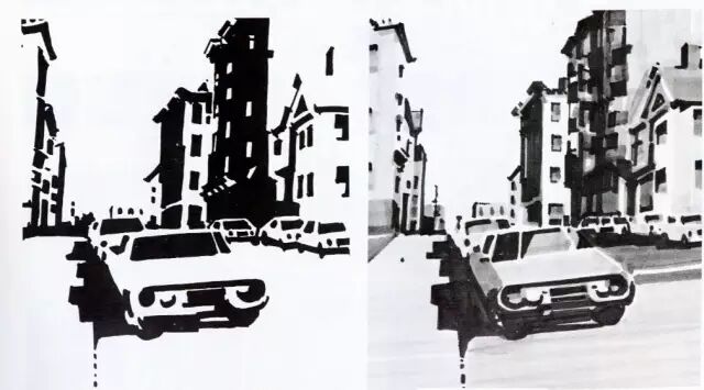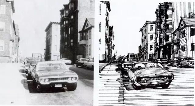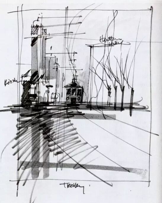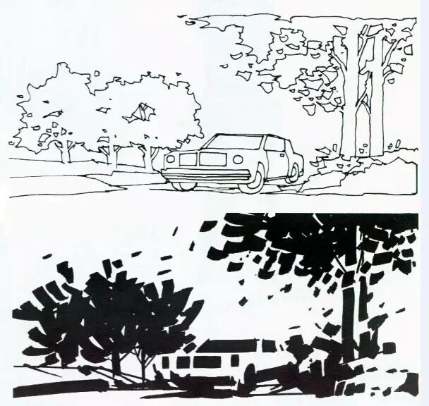 用马克笔高度概括,只画大的黑白形体,只注意对象及空间透视,大的关系和结构比例,舍去材料等一些无关的细节