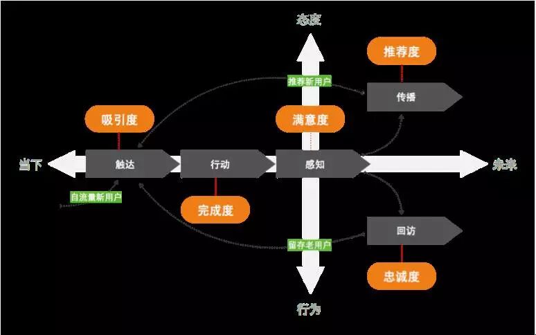 由于用户体验是指用户在使用产品/服务时的主观感受,这个概念包含的内容比较多,且比较宏观,必须找到合适的切入点(能较好解释用户体验的一些细分维度)和量化手段(可以观察,收集到数据的指标)才能有效评估体验的质量。 在用户体验领域,评估体验的模型,比较知名的有Google的HEART模型,但是由于国内外产品、文化的差异性,导致该模型的适用性受限。1688UED的同学以用户接触和使用产品的路径为主线,提出了用户体验的五度模型,从吸引度、完成度、满意度、忠诚度和推荐度五个维度来评估和量化用户体验质量。