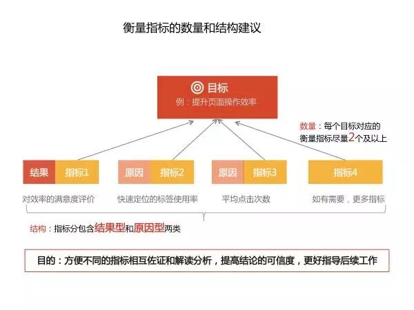 指标的制定除了是衡量目标是否达成外,还有个重要的作用在于帮助解读分析改版结果,从而为目标达成提供佐证和为后续的工作提供指导,因此,对于指标的的数量和结构的建议是