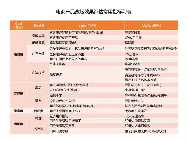 以下是笔者在五度模型的基础上,结合在电商网站的实践经验总结的较为常用的模型和指标,具体使用时还是要从自身产品特点(信息型VS工具型),改版目的入手来选择适合的指标。