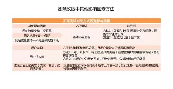 为了相对更科学、客观的了解设计、功能的改变带来的效果,就需要把其他因素的作用尽量去除或减少。由于当前改版的对比方式主要有两种, A/B测试(新老版本同时在线)和前后对比测试,所以下文就分别针对两种不同对比方式介绍一些对策。 必须指出,由于一些因素本身就难以区分开,比如某个页面上的功能和内容(如新功能才有的新内容/促销活动/商品)所以笔者目前也没有很好的对策能区分开这种因素对改版效果带来的影响。