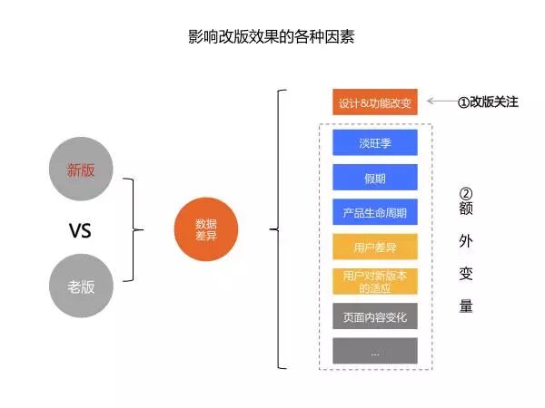 如果对改版效果的精准性没有那么高的要求,一般主要注意取数时避开淡旺季、假期,等新版本上线一段时间再分析即可,如果条件允许,尽量使用A/B测试的同时对比方法。