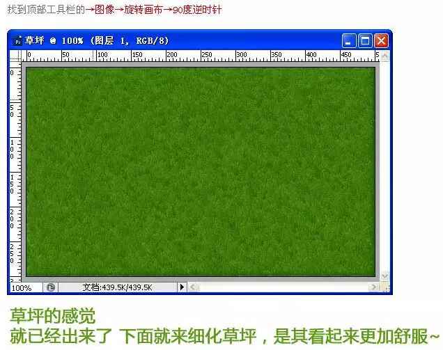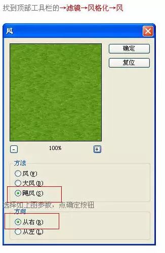 教程的主体部分是绿草部分的制作,主要用滤镜来完成,先用杂色等滤镜制作一些杂点,然后用模糊及风滤镜把杂点变长做成草地的效果。