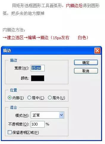12、用矩形选框工具画圆弧形,内描边后得到圆形弧,把多余的地方擦掉。
