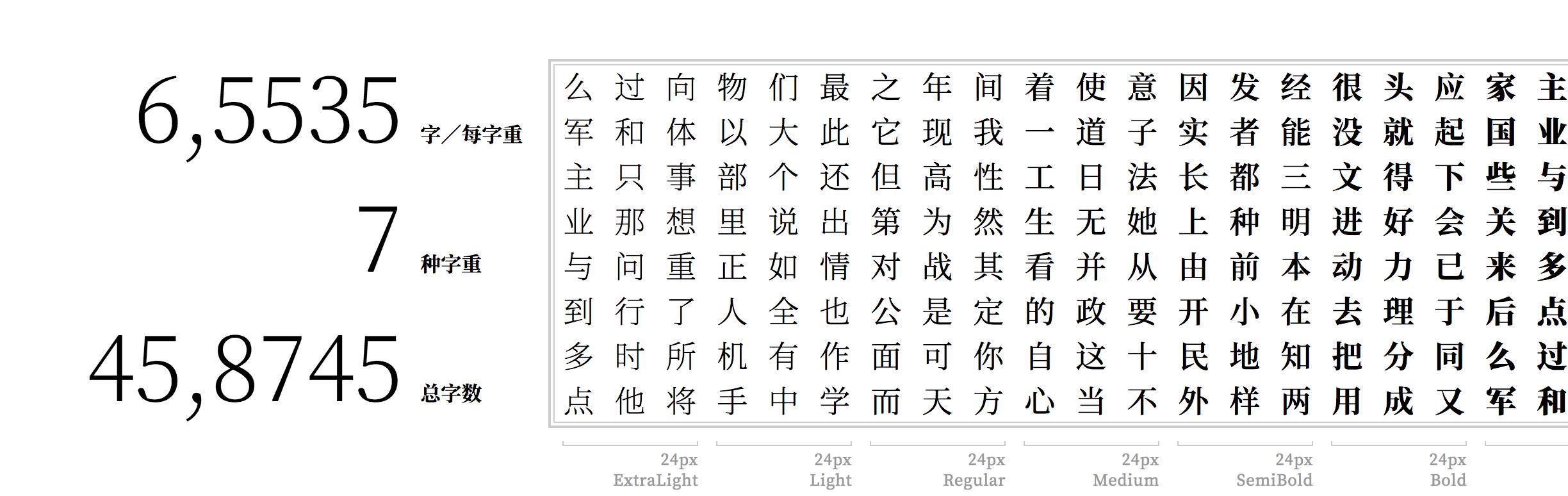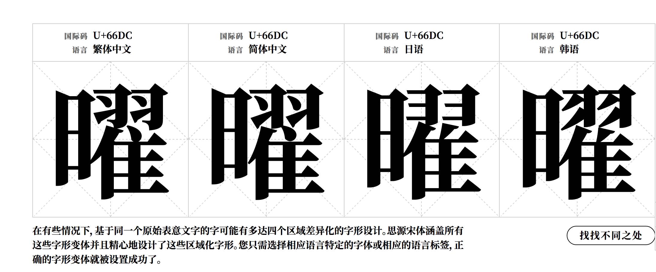 思源宋体支持四种不同的东亚语言(简体中文、繁体中文、日语和朝鲜语),7 种粗细类型中的每一种都有 65,535 个字形,可共同呈现一致的视觉美感。该字体还包含多个西方字形,支持拉丁语、希腊语和西里尔文脚本,这些字形均来源于 Source Serif。