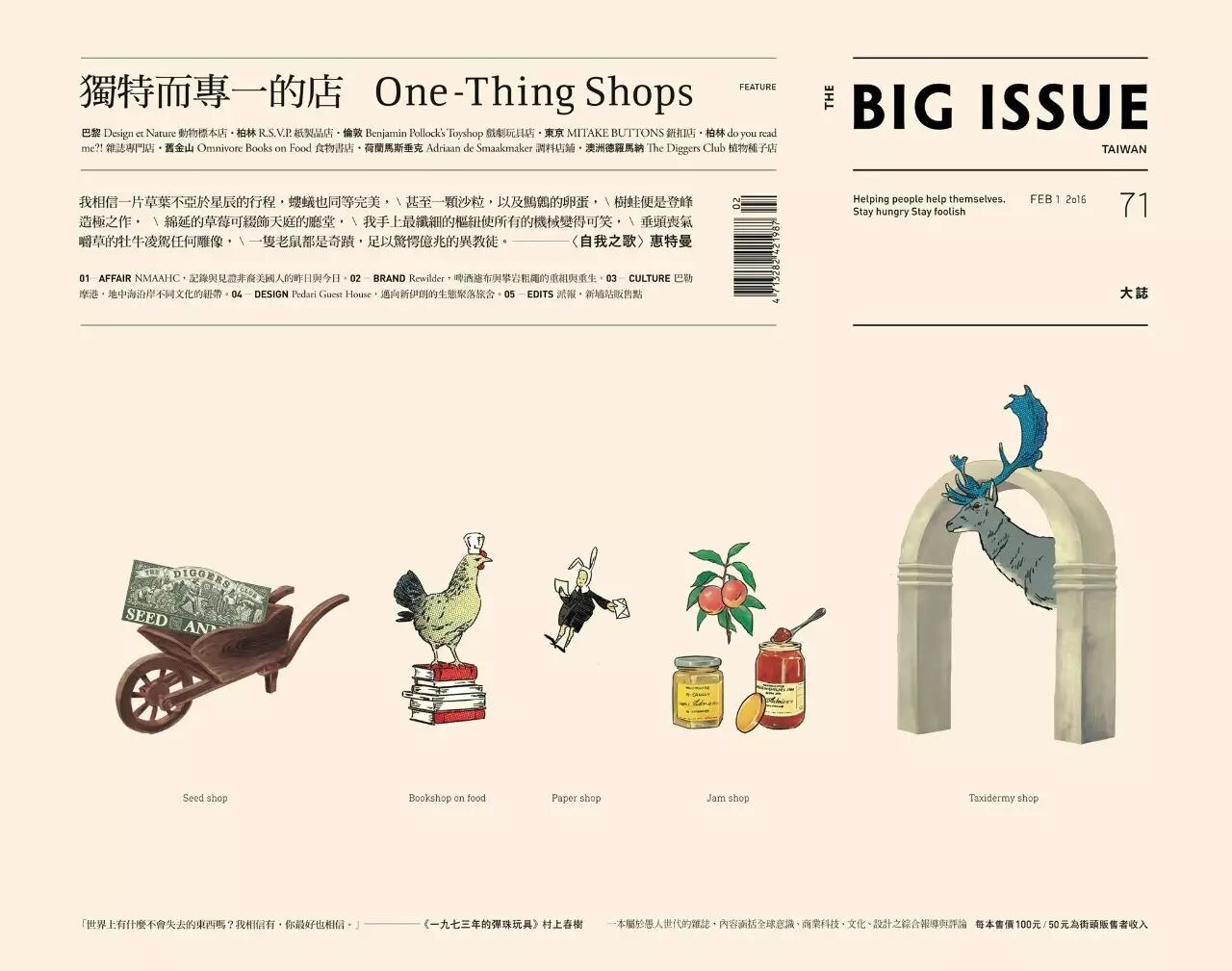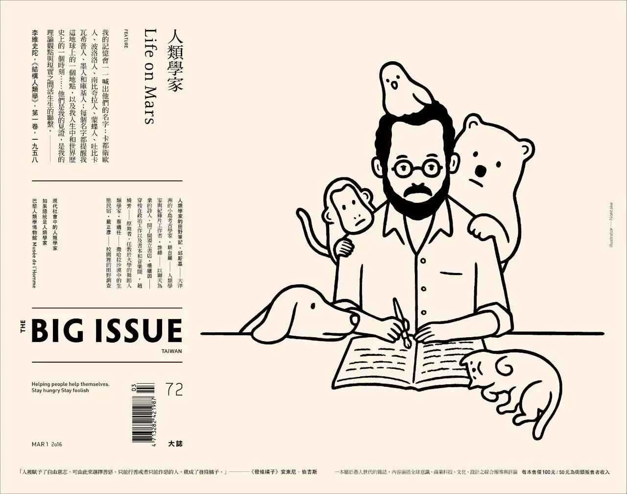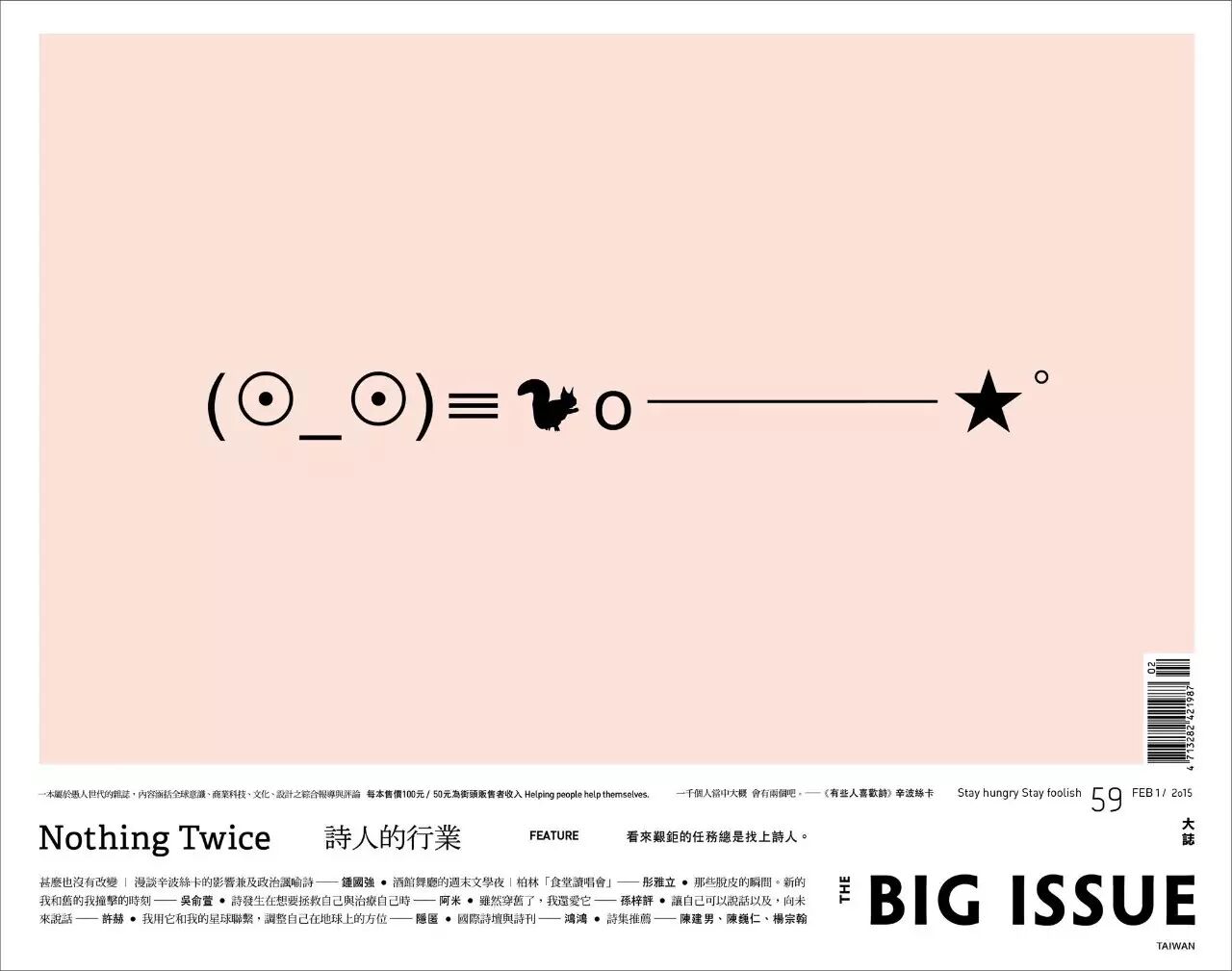 不管是请知名平面设计师聂永真设计每期封面,还是杂志内文主题,《The Big Issue》 给人时尚、文艺又知性的印象,这时杂志内容已不是绝对的重点,因为我们花钱买的是「向贩售员买《The Big Issue》 」这个经验。