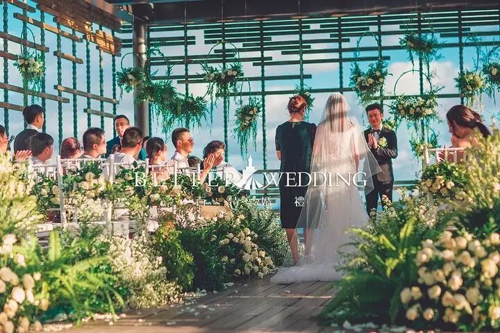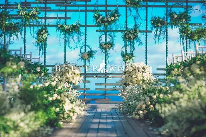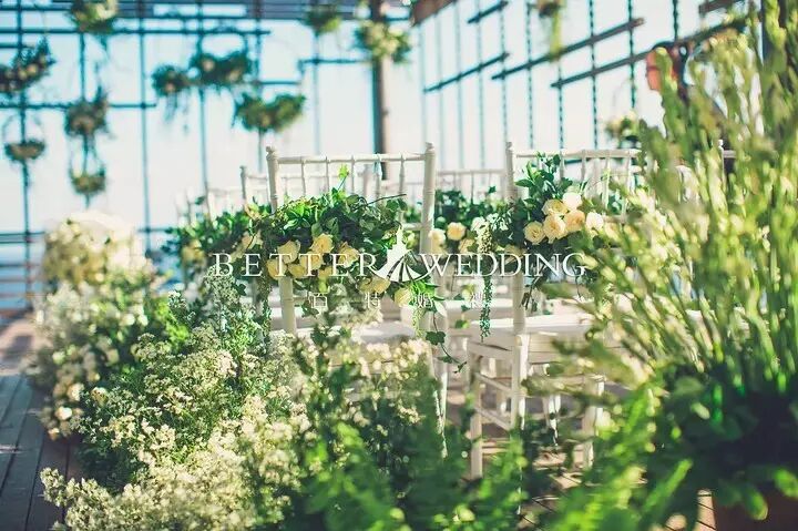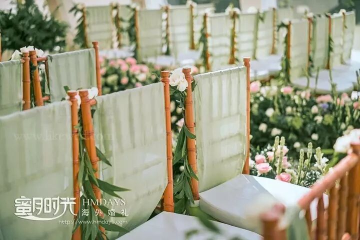 在港丽无限教堂婚礼运用绿植,鲜花,纱,搭配以优雅灵动的木雕元素,表现出了唯美、梦幻的亲森系场景, 营造一种绿野仙踪的感觉。随风轻飘的薄纱,仿佛唱诗班的歌声萦绕耳畔~