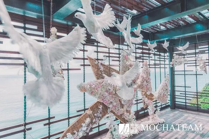 活用七巧板的元素,同时将三角元素变形 设计师在新人选择的酒店背景 尽力还原悉尼歌剧院的浪漫 无数只小鸟元素,扑闪着翅膀 翱翔于海岛自由爱情的同时 又代表了婚姻,一种“倦鸟归巢”责任。
