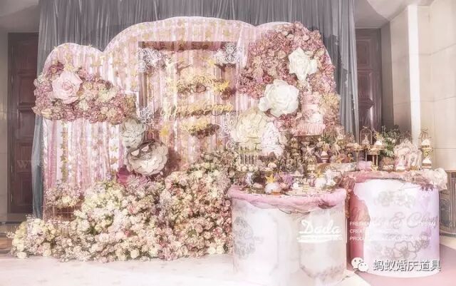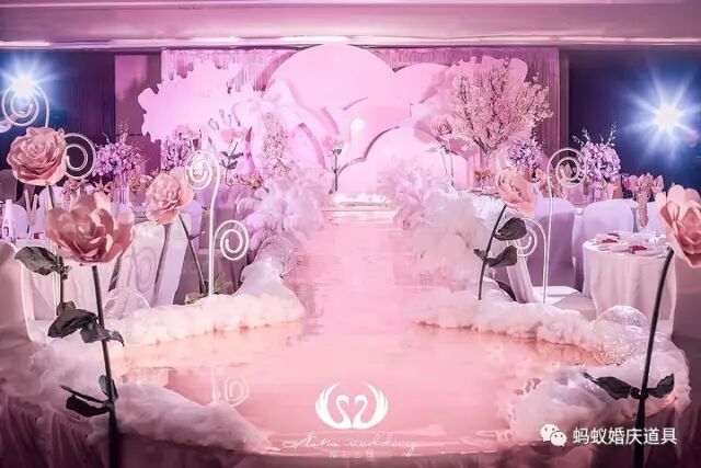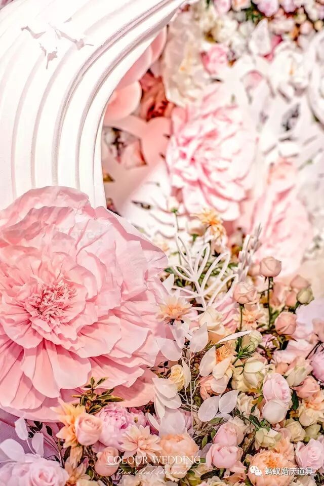 淡粉色的婚礼纸花装饰传递出芬芳可人的氛围,