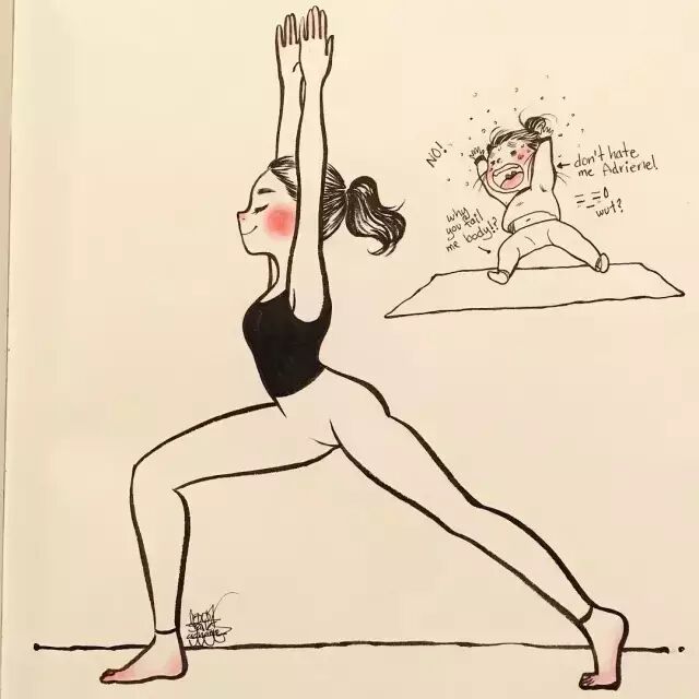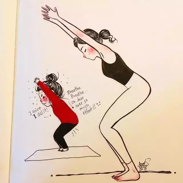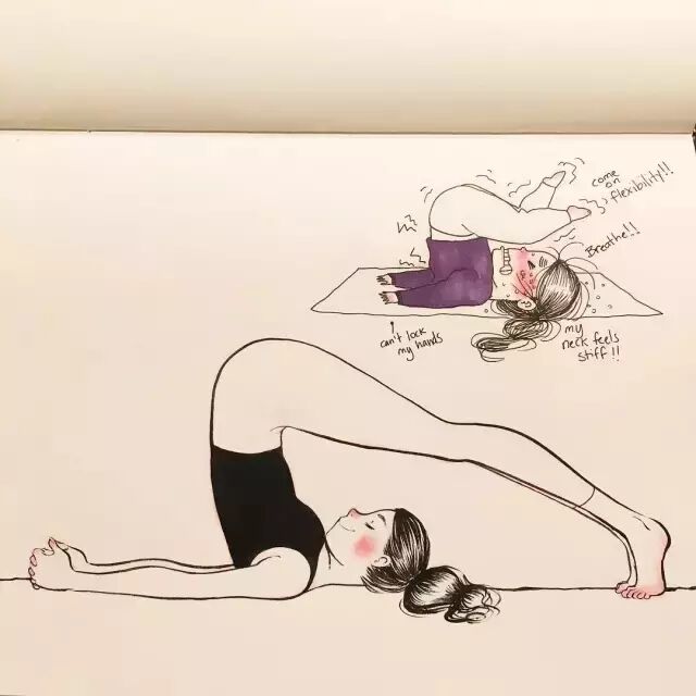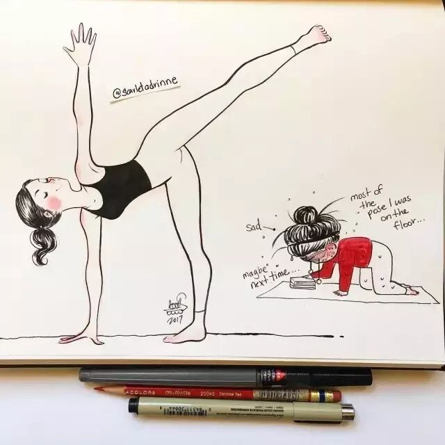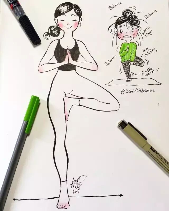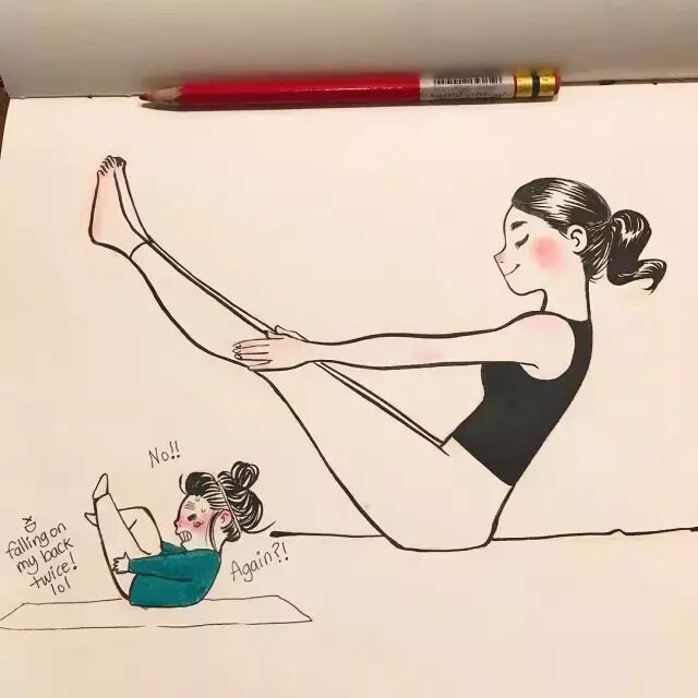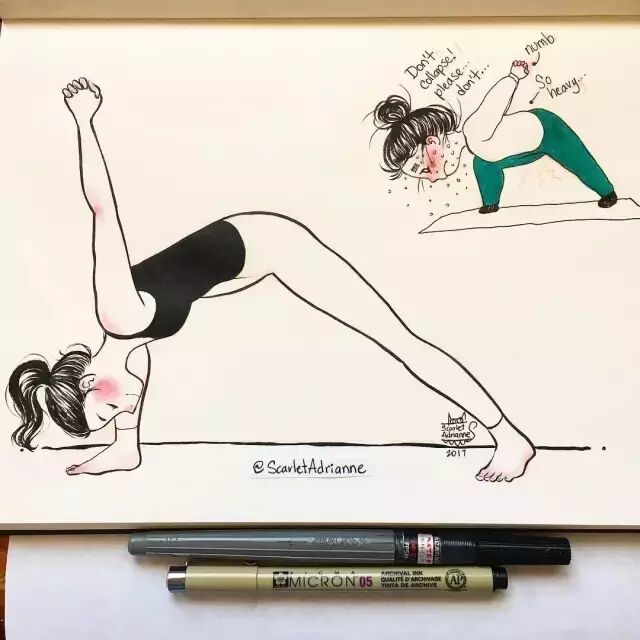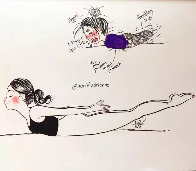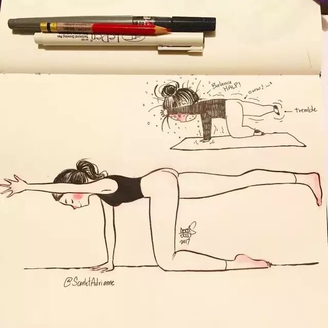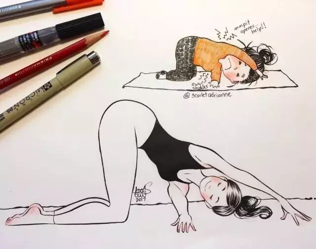 不过不用担心,即便是你不会做,但是你可以画啊。墨西哥的插画家 Adriana Rodríguez León 就用萌萌的图画出了初学瑜伽时的状态。是不是画的就是你?