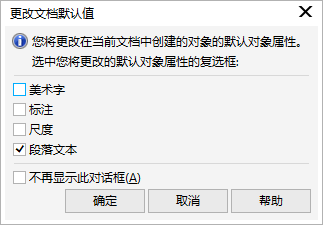 或者在没有选择文本的状态下,则会跳出“更改文档默认值”复选框,选择你需要更改对象属性的选项,单击确定。