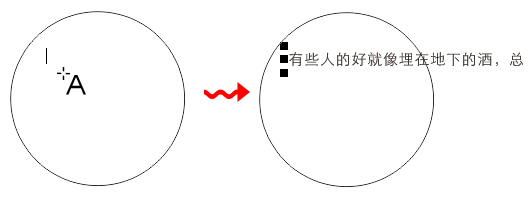 当文本光标在在圆上或圆内时,光标会显示三种状态,上图所示,即为输入文本标志,这个图标,表示可以在页面的任何位置添加美术字和段落文本;下图(左)所示,为添加路径文本,文本可以输入到自定义的图形轮廓线上去,使文本沿着轮廓线的走向排布;下图(右)所示,是可以将段落文本添加到对象内部,将指针置于该对象的内边框上,然后在指针变为插入光标时开始键入内容。