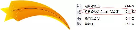 步骤八 此时的星星是按照弧线排列的,同时选中弧线和星星,单击鼠标右键,在弹出的快捷菜单中选择“拆分路径群组上的混合”,点击弧线删除。