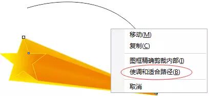 步骤七 选中调和好的星星,鼠标右键拖拽至绘制好的曲线上,松开鼠标,在弹出的快捷菜单中选择“使调和适合路径”。