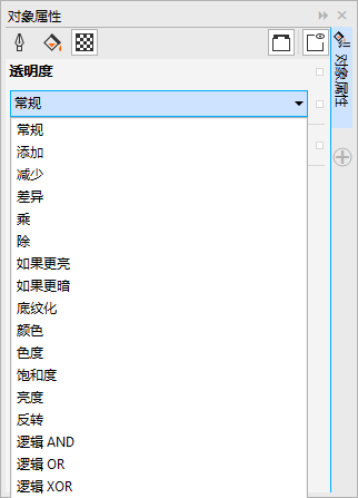 3. 在选中矩形的状态下,选择工具箱中的“透明度工具”,在其工具栏属性的“合并模式”中单击右侧黑色三角号,出现多种透明度合并模式的设置。这类似于PS中的图层混合模式,如:“标准模式、叠加模式、柔光模式”等等。